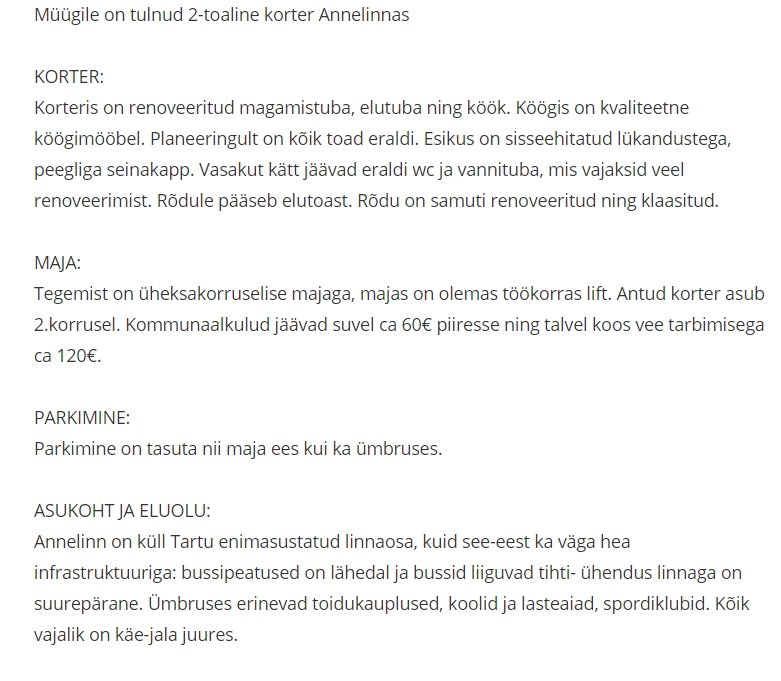 Too välja oma kinnisvara parimad omadused. Hea müügitekst on ülevaatlik ning samas on seda lihtne ja mugav lugeda. Soovitatav on jaotatada müügitekst lõikudeks, sisaldades kategooriaid, nagu näiteks: ELAMU või KORTER, PLANEERING, ASUKOHT, PARKIMINE jms. Müügitekst ei tohiks olla liiga pikk ja lohisev, ega ka liiga lühike. Hea müügitekst on informatiivne, kuid samas paeluv ning tekitab huvilises positiivse emotsiooni. Näitena võib lugeda erinevaid kv.ee keskkonnas olevaid kuulutusi. Seejuures märka, millised neist tekitasid huvi ja võta aluseks nende ülesehitus ja stiil.