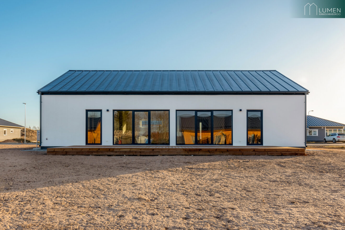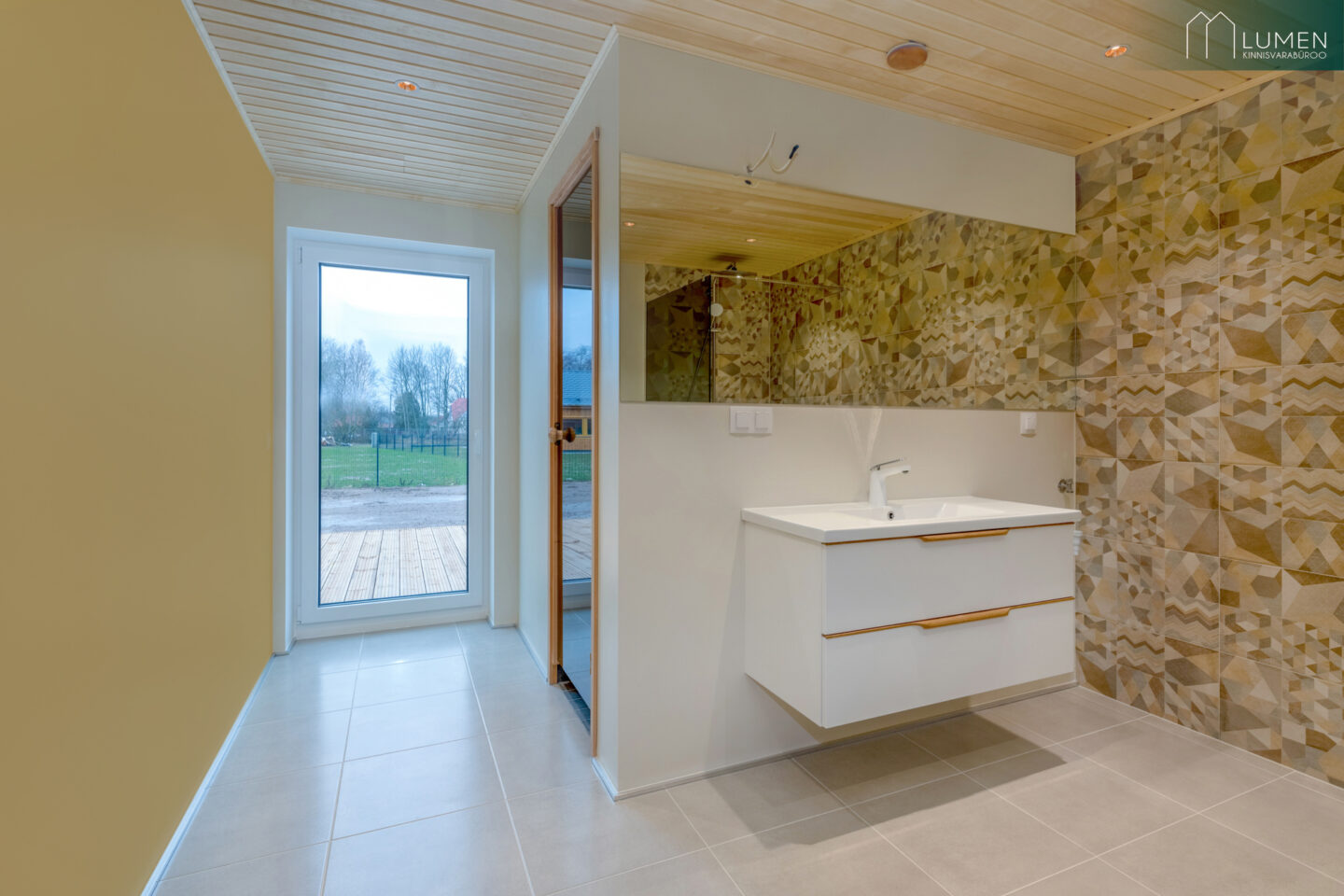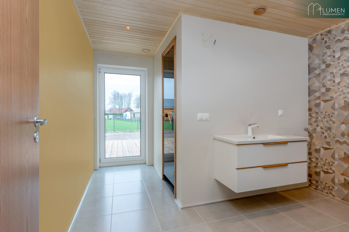 Terrassile (30m2) pääseb nii elutoast kui vannitoast. Maja ette tekib räästakastile samuti ala, kuhu saab panna tooli ja nautida hommikupäikest.
