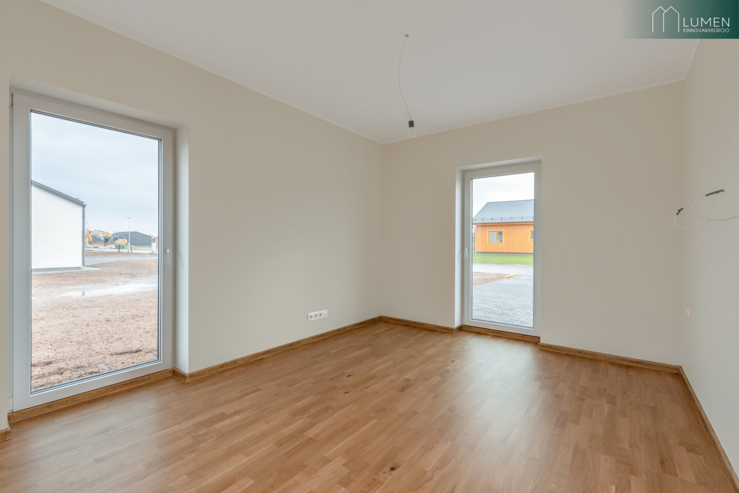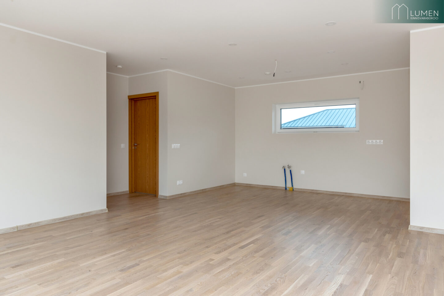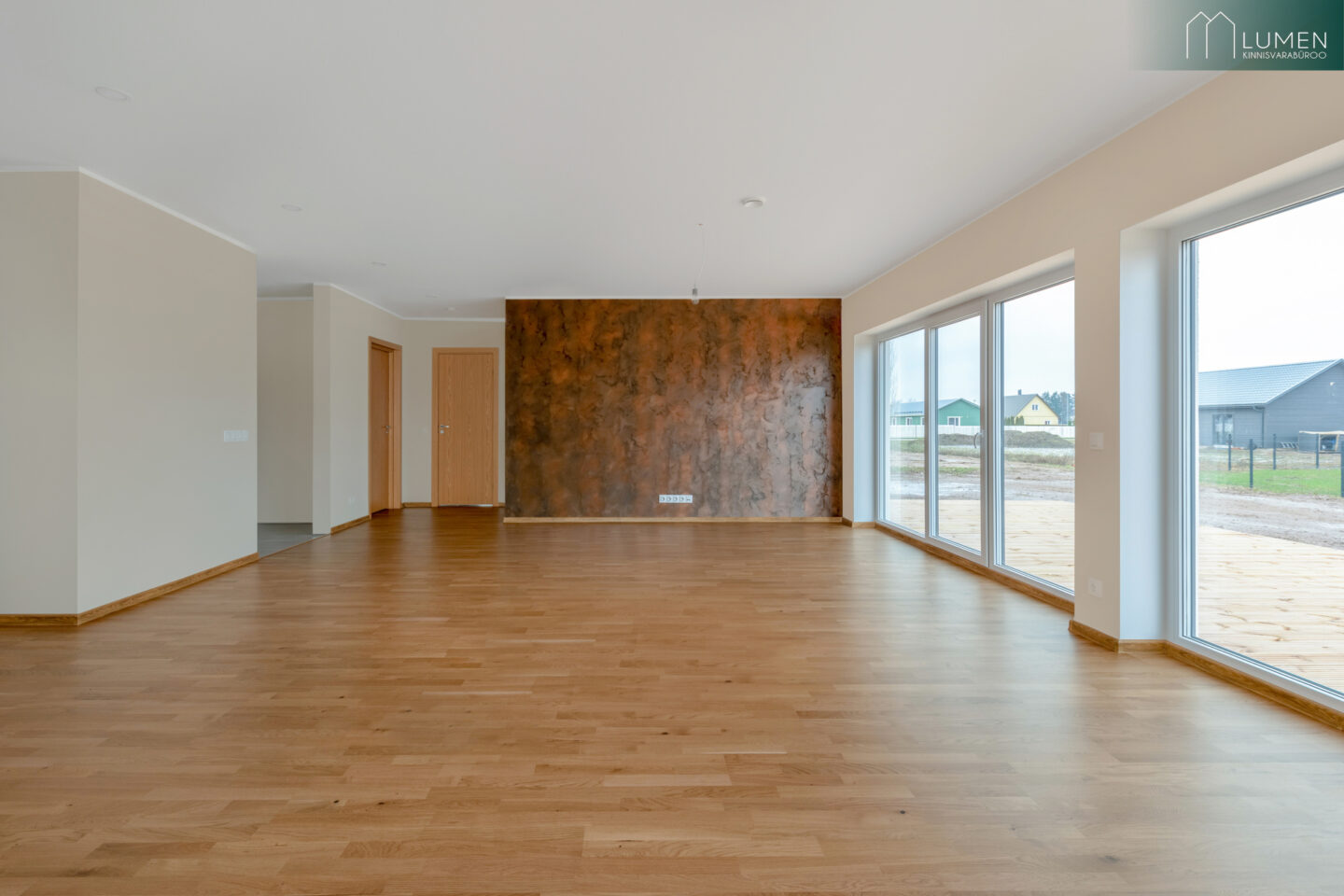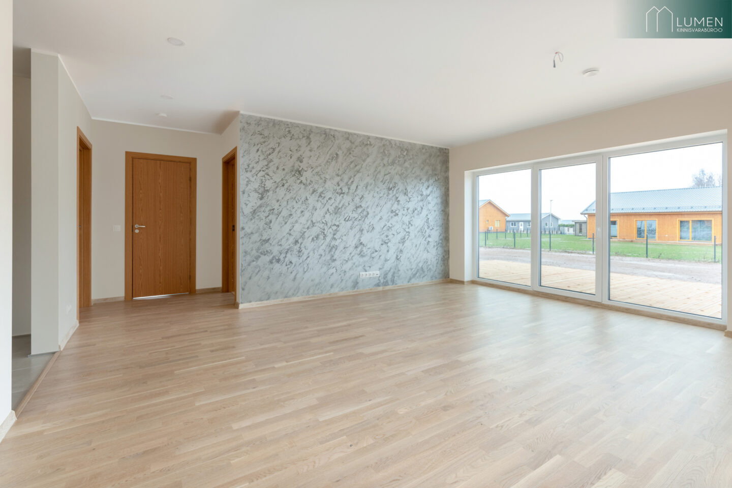 Majas on planeeringult esik (8,7m2) ja tehnoruum. Tehnoruumis on piisavalt ruumi pesumasina ja kuivati paigaldamiseks. Avatud köök ja elutuba (kokku 45,9m2) on läbi maja planeeringuga. Elutoast viivad uksed suuremasse magamistuppa (15,1m2) ja vannituppa ning sauna. Esikust vasakule jäävad kolm magamistuba ja WC.