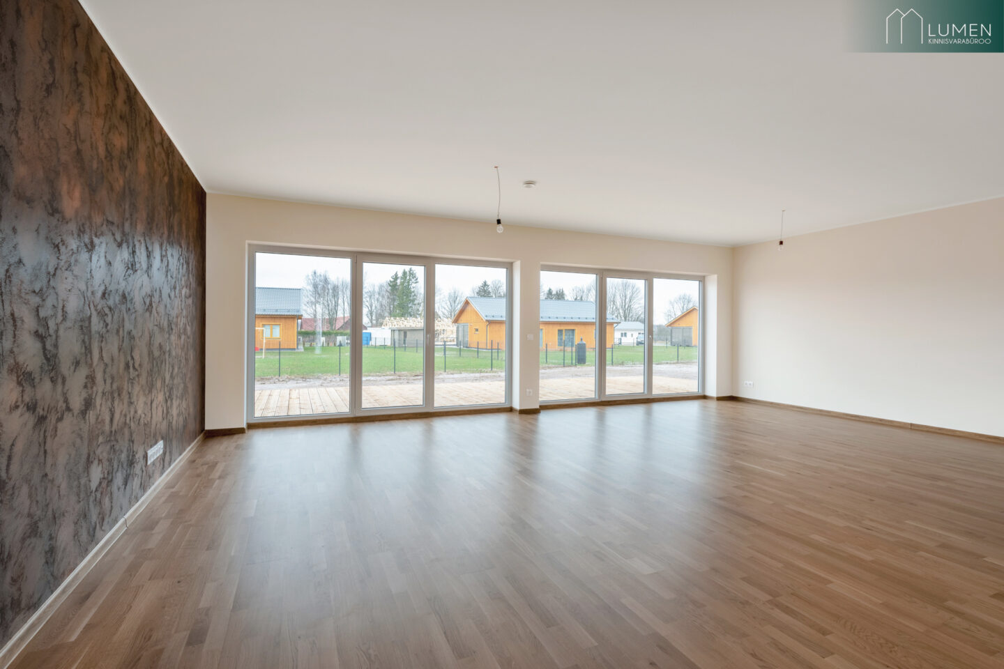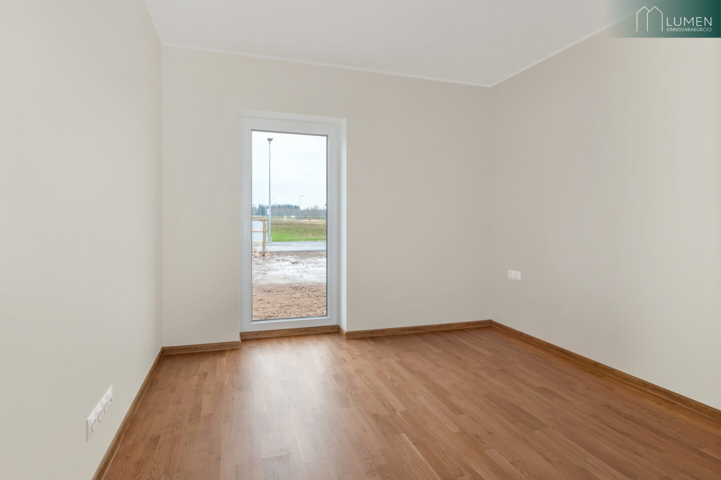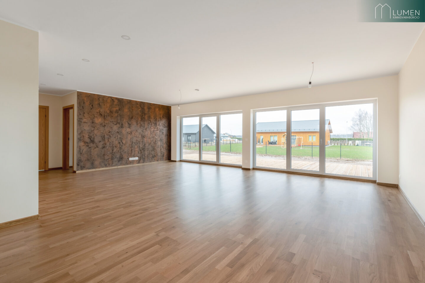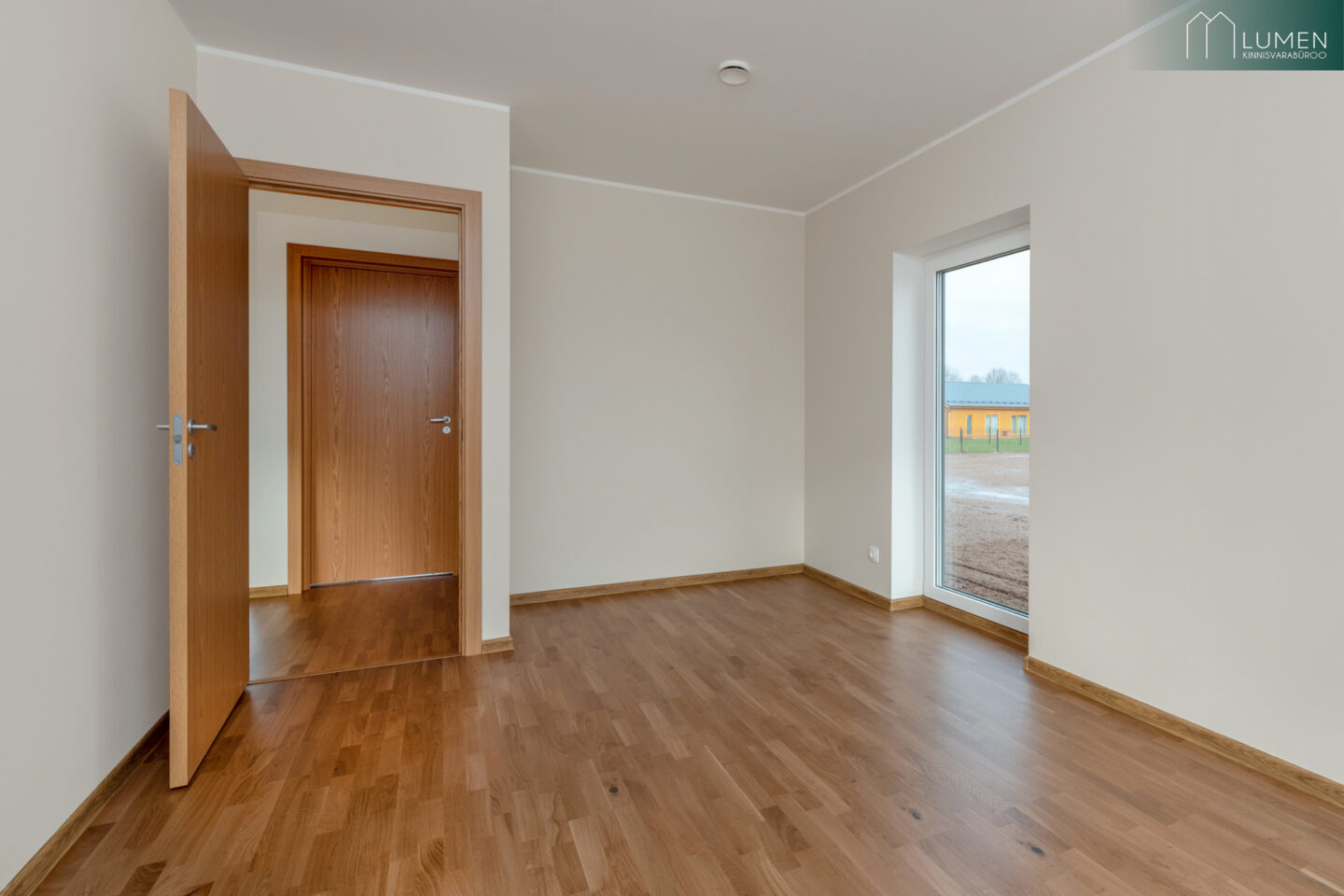 Majas on planeeringult esik (8,7m2) ja tehnoruum. Tehnoruumis on piisavalt ruumi pesumasina ja kuivati paigaldamiseks. Avatud köök ja elutuba (kokku 45,9m2) on läbi maja planeeringuga. Elutoast viivad uksed suuremasse magamistuppa (15,1m2) ja vannituppa ning sauna. Esikust vasakule jäävad kolm magamistuba ja WC.