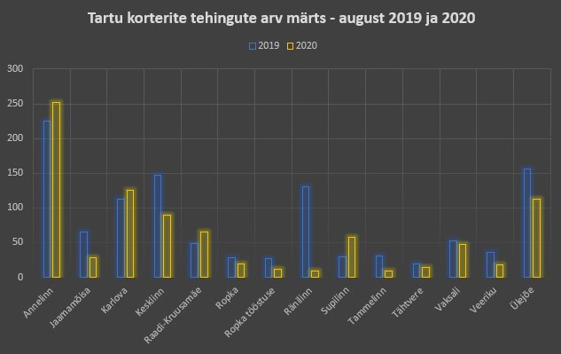 Võtsime kinnisvaratehingute väljavõtte 2019 aasta märtsist-augustini ja sama tegime ka 2020 aasta kohta. Vaadates tehingute arvu, siis 2019. aastal tehti Tartu linnas kokku ca 1110 korteriomandi ostu-müügitehingut ja 2020 aasta samal ajal tehti kokku 860 tehingut korteriomanditega. Sellest on ka näha, et langus on olnud ca 29%. Kas sellest võime järeldada, et koroona on halvasti mõjunud Tartu kinnisvaraturule? Kindlasti mitte. 2019. aastal oli Tartu korteriomandi keskmine m2 hind ca 1497€ ja 2020 aastal 1587€. Millest saame järeldada, et tehingu hinnad on tõusnud ca 6%.